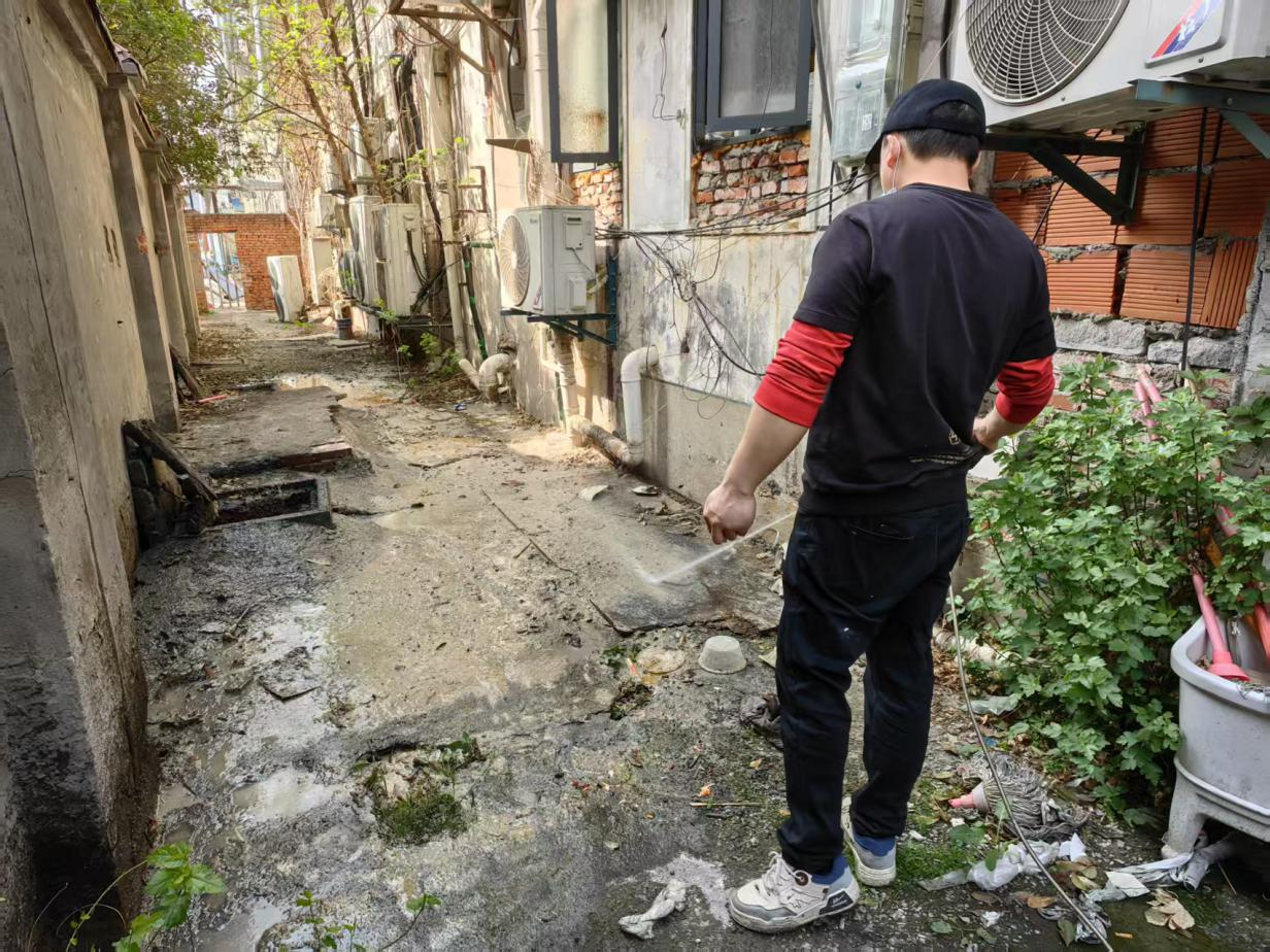 为解决居民这一难题,工作人员立刻召集社区志愿者, 时间赶到现场实地查看。经核实由于化粪池管道堵塞造成污水外溢,为了不影响辖区居民正常生活,社区 时间进行处理。由于井盖年久生锈无法正常打开,工作人员们想尽各种办法撬开井盖,通过长铁钩、竹竿、吸粪车等工具,对化粪池进行细致地清理和疏通。